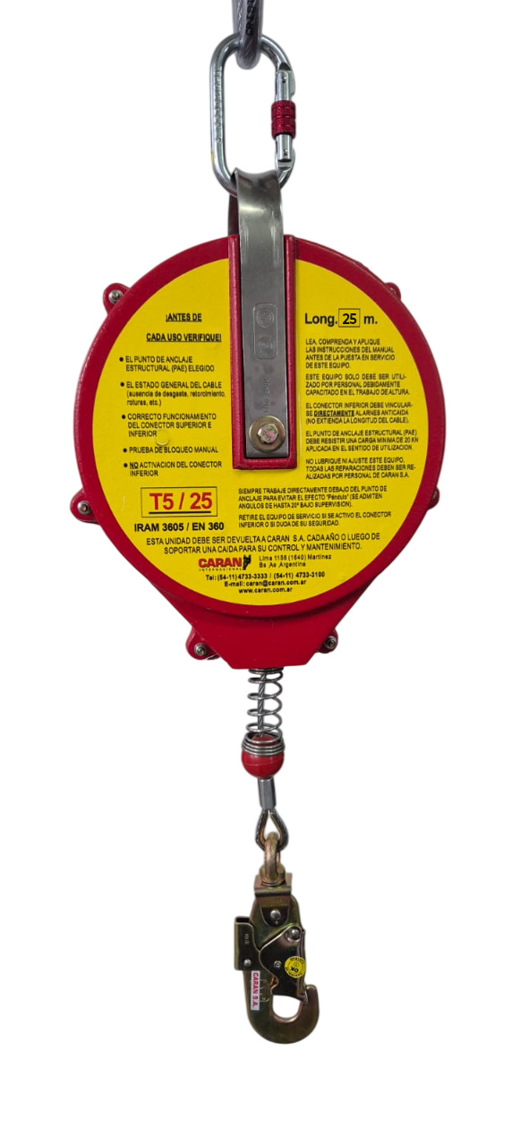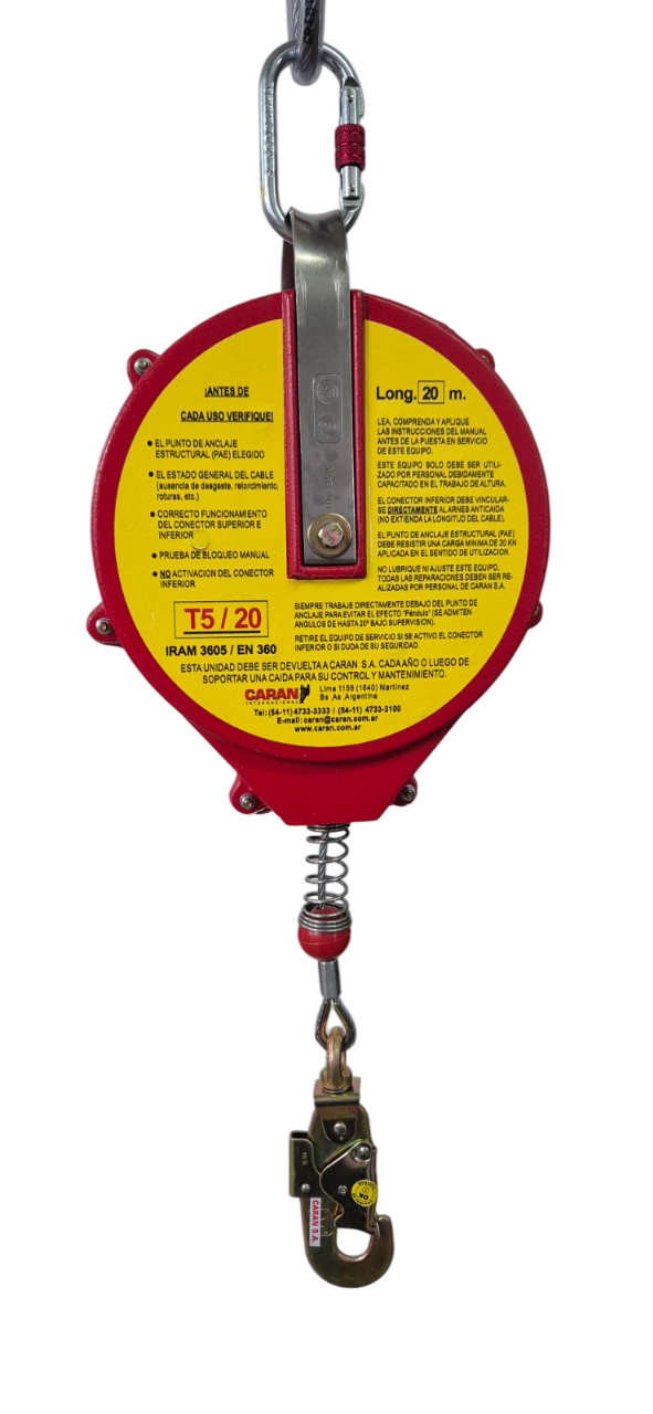 • Dispositivo anticaída con elemento de amarre retráctil de 20 m de longitud destinado a facilitar el desplazamiento del usuario en una amplia zona de trabajo brindándole protección contra eventuales caídas de altura. En caso de caída el equipo bloquea por aceleración del elemento de amarre retráctil.